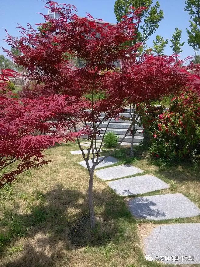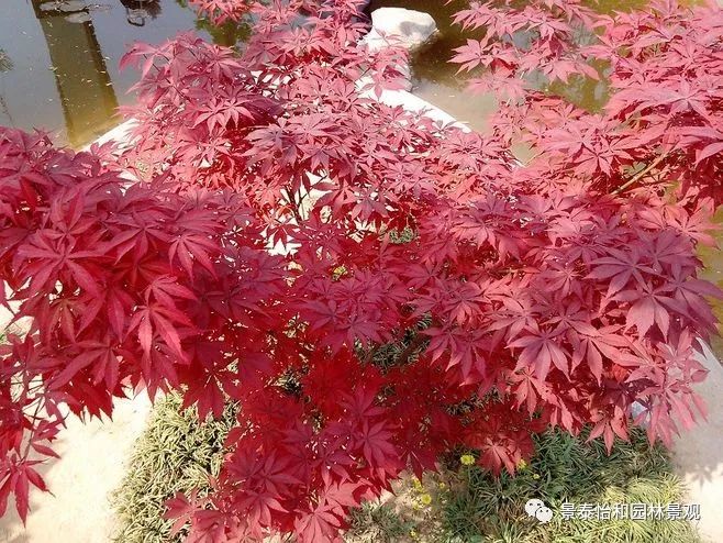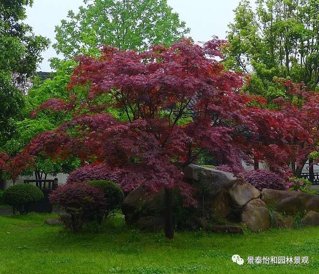 形態特征:落葉小喬木。樹姿開張,小枝細長。樹皮光滑,呈灰褐色。單葉交互對生,常叢生于枝頂。葉掌狀深裂,裂片5-9.裂深至葉基,裂片長卵形或披針形,葉緣銳鋸齒。春、秋季葉紅色,夏季葉紫紅色。嫩葉紅色,老葉終年紫紅色。